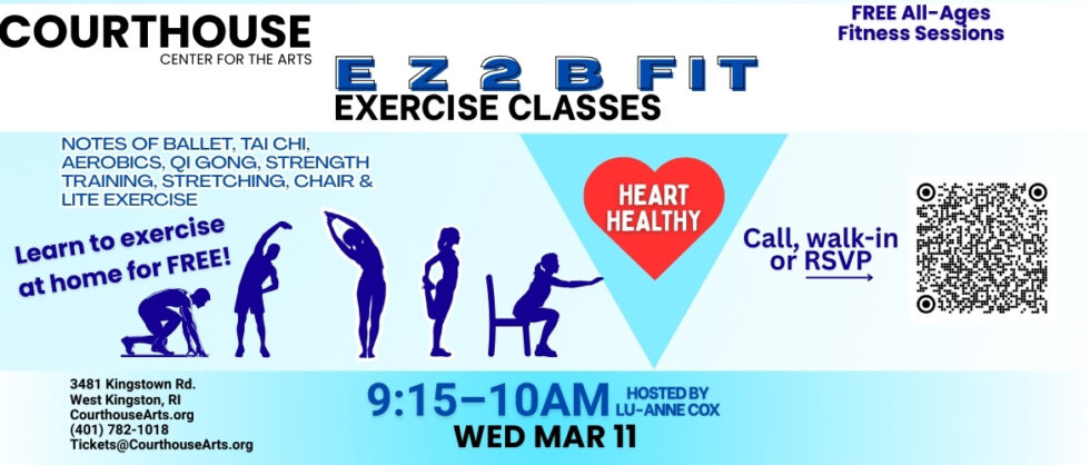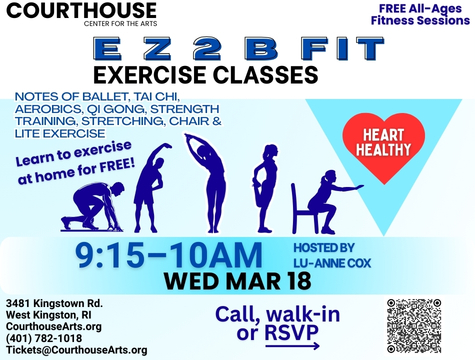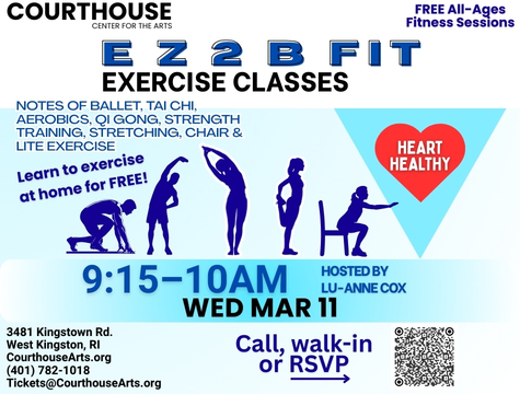 EZ 2 B Fit Exercise Class with Lu-Anne Cox 3/18/2026 9:15-10AM Featured March 18 @ 9:15 am - 10:00 am Courthouse Center for the Arts 3481 Kingstown Rd, West Kingston, RI, United States RSVP Free Tickets