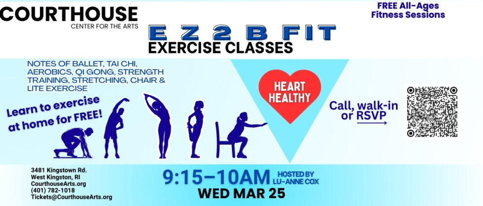EZ 2 B Fit Exercise Class with Lu-Anne Cox 3/25/2026 9:15-10AM Featured March 25 @ 9:15 am - 10:00 am Courthouse Center for the Arts 3481 Kingstown Rd, West Kingston, RI, United States RSVP Free Tickets
